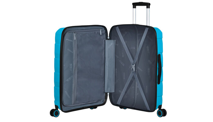 Elastische Kreuzbänder im Bodenfach und eine Trennwand mit Reißverschluss-Netztasche zur einfachen Aufbewahrung und Trennung deines Gepäcks