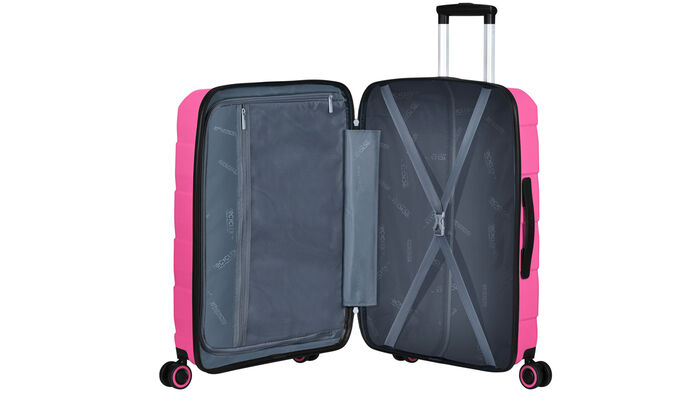 Elastische Kreuzbänder im Bodenfach und eine Trennwand mit Reißverschluss-Netztasche zur einfachen Aufbewahrung und Trennung deines Gepäcks