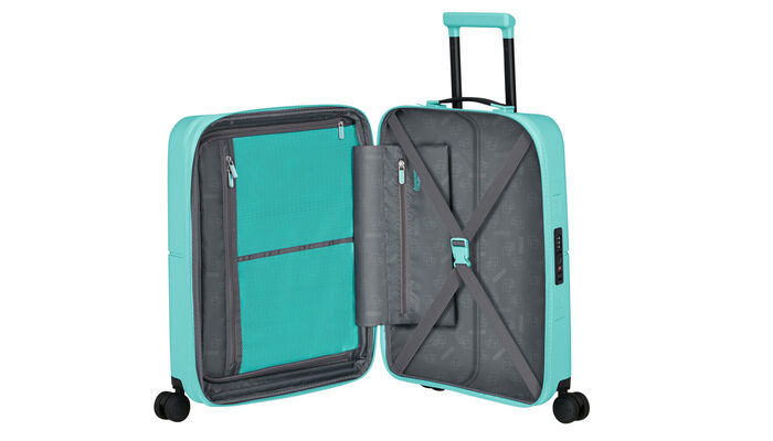 Einfaches Verstauen und Trennen deines Gepäcks mit den elastischen Kreuzbändern im unteren Fach und der Trennwand mit Netztasche und Reißverschluss im oberen Fach.