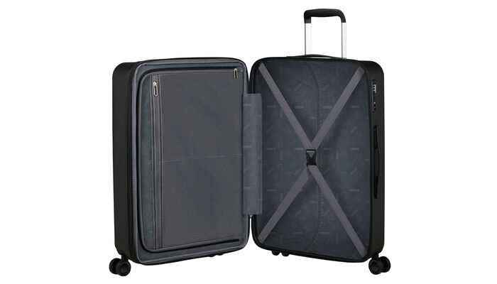 Einfaches Verstauen und Trennen deines Gepäcks mit den elastischen Kreuzbändern im unteren Fach und der Trennwand mit Netztasche und Reißverschluss im oberen Fach.