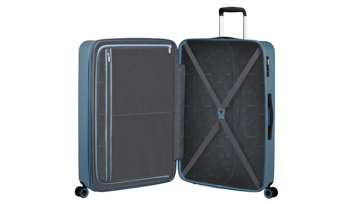 Einfaches Verstauen und Trennen deines Gepäcks mit den elastischen Kreuzbändern im unteren Fach und der Trennwand mit Netztasche und Reißverschluss im oberen Fach.