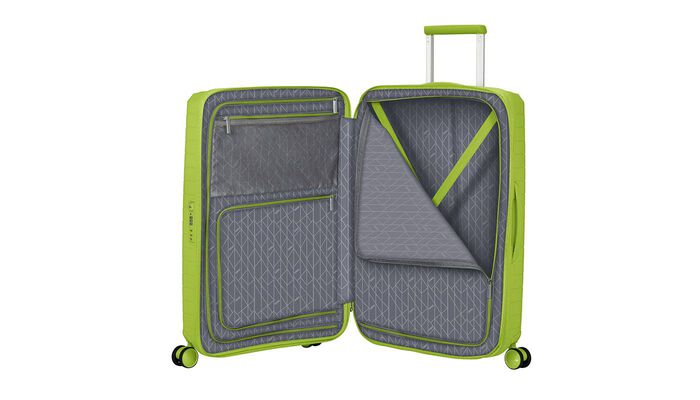 - 100 % (nach Gewicht) des Innenfutters, der Dehnfalte und der Reißverschlüsse bestehen aus recyceltem PET-Kunststoff, der aus 10 recycelten 500-ml-Flaschen hergestellt wurde.