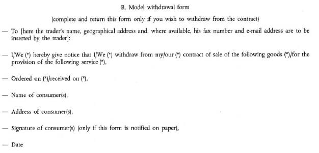 Sie haben das Recht, binnen vierzehn Tagen ohne Angabe von Gründen diesen Vertrag zu widerrufen. Die Widerrufsfrist beträgt vierzehn Tage ab dem Tag an dem Sie oder ein von Ihnen benannter Dritter, der nicht der Beförderer ist, die Waren in Besitz genommen haben bzw. hat, oder, im Falle eines Vertrags über mehrere Waren und die getrennt geliefert werden, an dem Sie oder ein van Ihnen benannten Dritter, der nicht der Beförderer ist, die letzte Ware in Besitz genommen haben bzw hat.