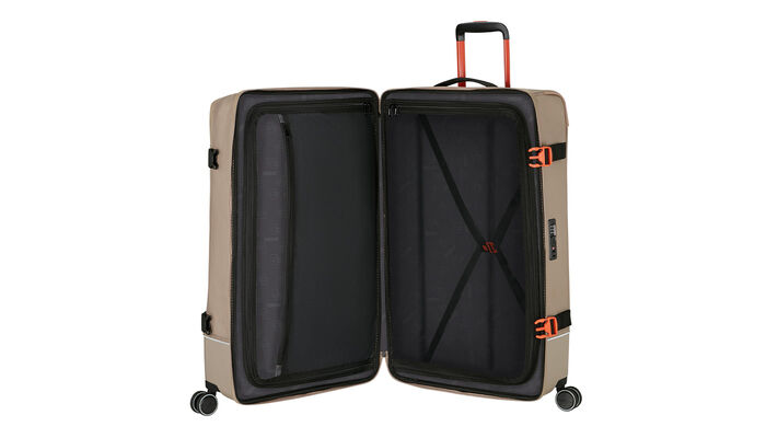 Trennwände in beiden Fächern. Extra Zubehör-Netztasche für kleinere Gegenstände. Kreuzbänder im unteren Fach